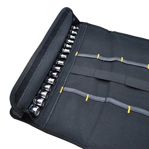 20 pockets to organize and protect smaller tools or Accessories.15 small side sockets pockets to hold other tiny tools and Accessories. With heavy-duty elastic strap keeps tools in place.