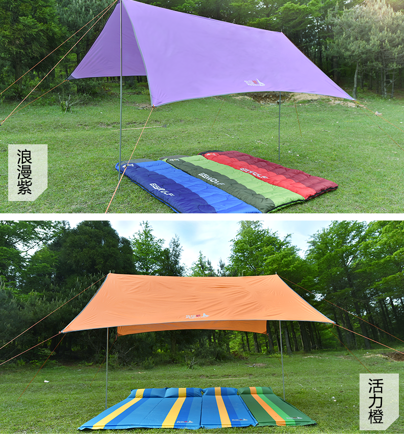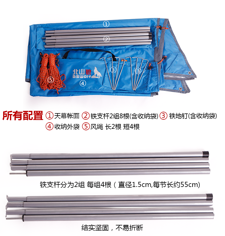 Configuration: a rainfly, an outer bag, two hob rods, eight nail, 6 wind rope, two bag