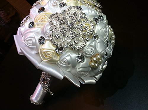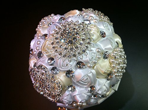 This PRINCESS DIARY bouquet has a base of about 3 dozen satin roses in white and cream colors. The top is garnished with 5 big brooches about 30 smaller brooches with pearl and crystal sprays throughout the bouquet. The base holder is covered in a floral pattern lace with 20-30 pearl sprays and a great royal style brooch hanging.