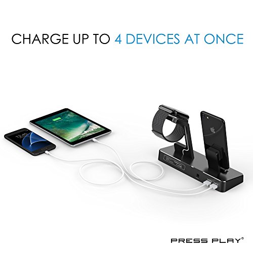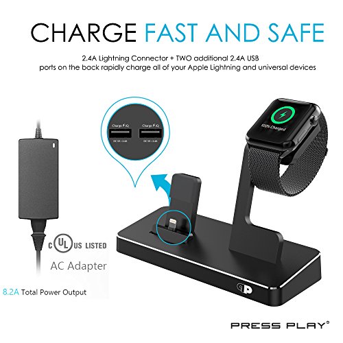 CHARGE 4 DEVICES AT ONCE - Two Built-in USB Ports [2.4A each] allows you to charge your iPhone & Apple Watch along with any Two Additional Devices Powerfully at Once. Built-in Rapid-Charge Lightning Connector charges your device TWICE as FAST as your traditional 1a USB wall adapter. CHARGE FAST & CLEAN - UL Listed Power Adapter gives your dock the Boost it needs to charge 4 devices Powerfully & Clean, without any damage to your wall sockets. Provides 8.2A Total Power Output.