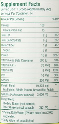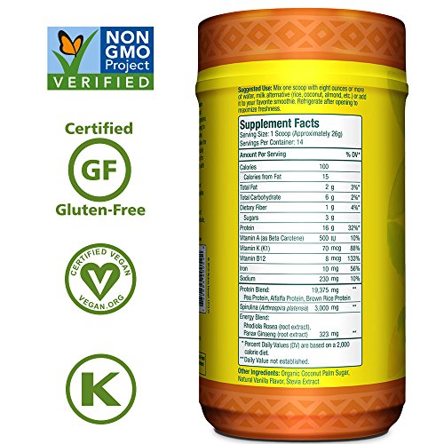 Each serving is powered by one full 3 gram serving of Hawaiian Spirulina for a full 16 grams of vegan protein (from Hawaiian Spirulina, Pea, Rice and Alfalfa), plus energy boosters (Rhodiola & Ginseng), & a delicious creamy vanilla taste
