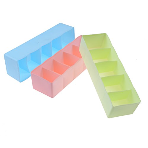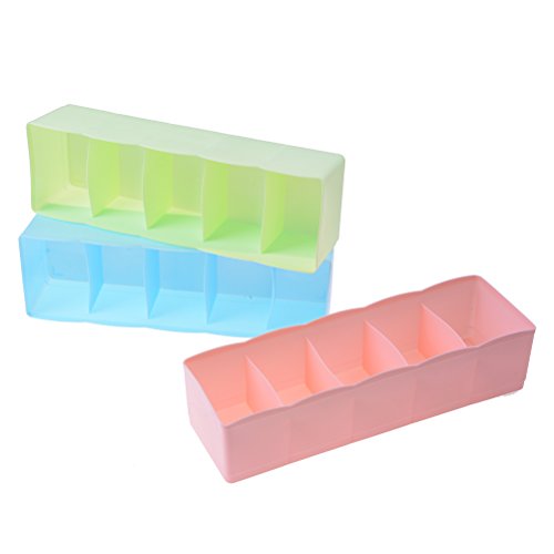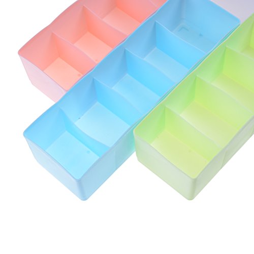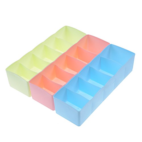 -. Feature : These durable plastic set of 3 drawer organizer bins are perfect for in the drawer,in the dresser,on the shelves,closets,and cabinets.They are perfect for bedrooms,bathrooms,kitchen,office or garage / Classify your underwear,socks,neck ties,scarves,bras,accessories,baby clothes,burp cloths,bibs,rattles,booties,socks,diapers and other nursery.Easy to find which one you want to wear without creating a mess / Size:26.5*8.5*7cm/10.4*3.3*2.8inch.Use high quality PP as raw materials,which is sturdy,healthy and eco-friendly / Easy to add & move dividers,each tray has 5 dividers,just adjust the drawer accroding to your need / Package Quantity:3 * Drawer Divider(Green,Pink and Blue)