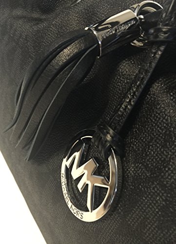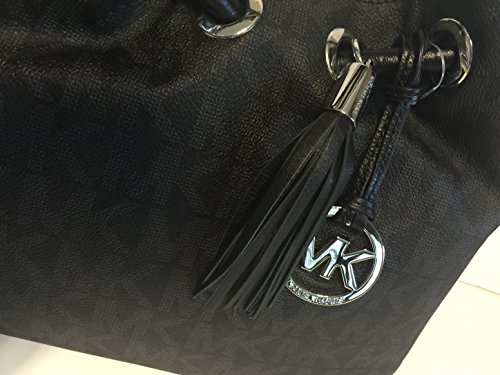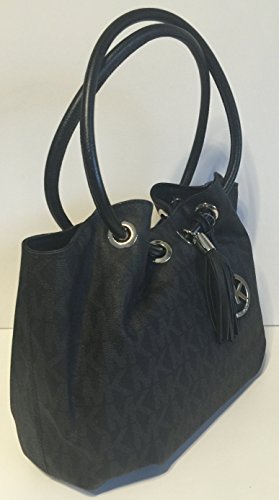 -. Feature : Michael Kors MD EW Ring Tote Signature MK Black PVC / Made of Black PVC Signature MK leather with silver-tone hardware / Exterior features dual ring top handles, magnetic top snap closure, front silver-tone MK logo medallion and leather tassel detail / nterior features 1 side wall zip pocket, 1 cellphone slip pocket, 3 side wall slip pockets and tan signature jacquard fabric lining / Measures approximately 14" W x 9.5" H x 5" D, Dual handle drop 9.5"
