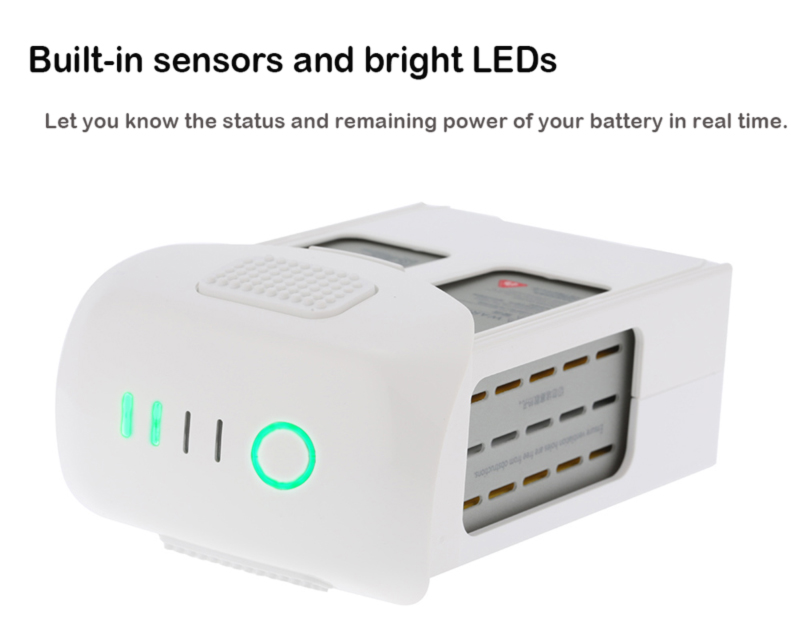 The Phantom 4 - Intelligent Flight Battery is a 5350mAh, 15.2V LiPo battery that is specifically designed for the Phantom 4, enabling optimal performance. The battery also has built-in sensors and bright LEDs that let you know the status and remaining power of your battery in real time.This high quality flight battery is just designed for RC super fans. Good choice for you to enjoy more flying joys. Just come and get it!