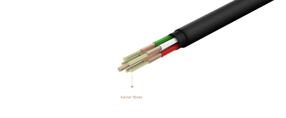 Kabel tembaga enamel dibungkus serat Kevlar, yang mengurangi kusut,