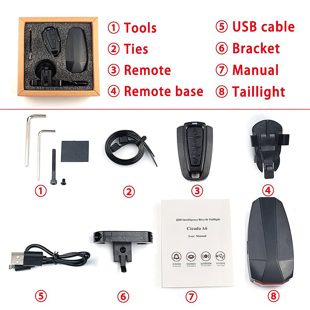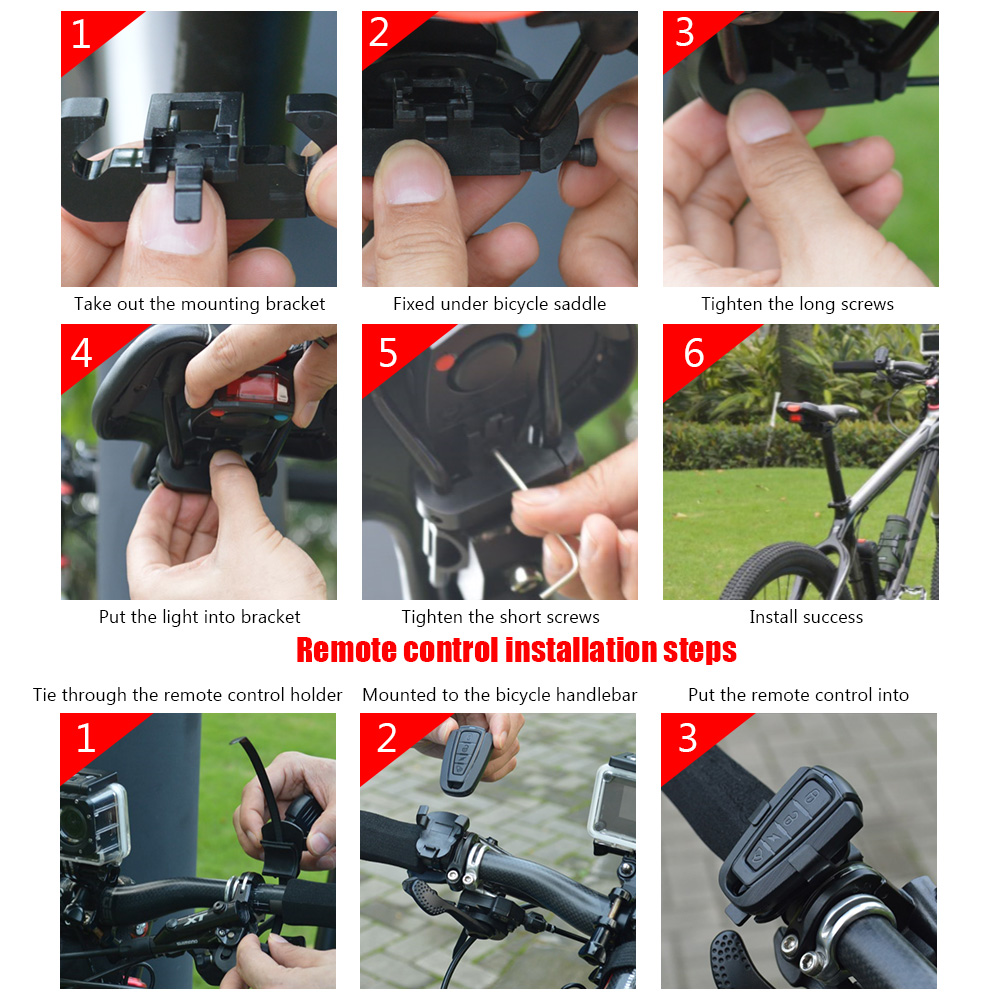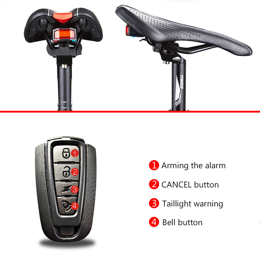 • Integrated intelligent alarm + Sound and light taillight + Wireless bell three functions in one of the taillights. All operations by remote control to complete, its full advantage of bicycle saddle bracket parts, the use of hidden design and installation, small and beautiful light, light weight and waterproof (IP 67).