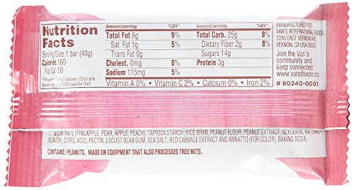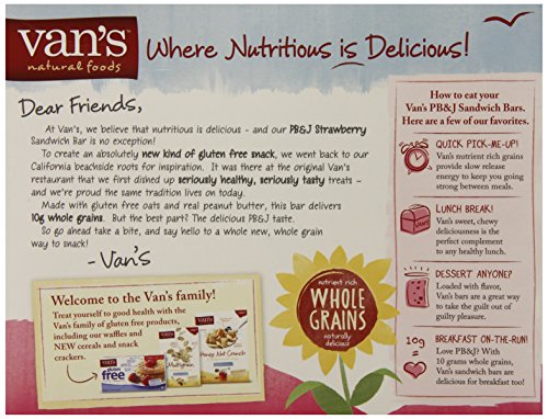 -. Feature : When you're in need of a snack, Van's strawberry and peanut butter sandwich bars are unbeatable / On one side, savory real peanut butter, on the other, natural strawberry filling / Every serving packs 10 gram of nutrient-rich whole grain oats and real peanut butter / Gluten free