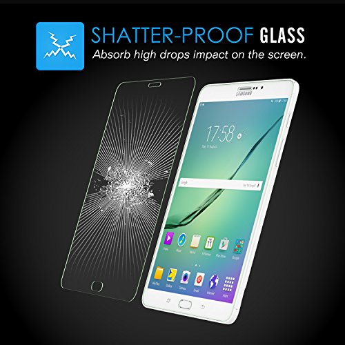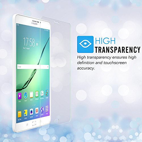 -. Feature : Premium Tempered Glass Screen Protector designed specifically for Samsung Tab S2 8.0 Inch 2015 Tablet for perfect protection on touch screen. / 9H hardness offers protection from scratch, crash, and shock, 0.33mm thickness helps maintain the original touch experience, 90% light penetration ratio preserves the original viewing quality. / 2.5D Anti-chip rounded edge improves gliding and grip experience. Easy to clean Oleophobicity coating reduces fingerprints and oily streaks. / Advanced fitting technology makes convenience for the fitting and removal. / No bubbles or residue.