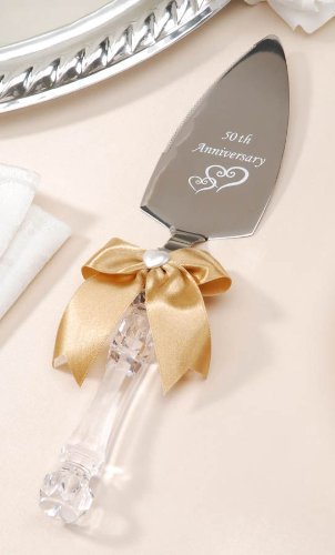 Celebrate a 50th anniversary in style with this lovely crystal handled cake server. Imprinted with a stylistic heart design and the words "50th Anniversary" on the blade. Narrow golden ribbon wraps around center, with pearl heart placed in the middle of a simple tie bow. Handle is of high quality, clear plastic with cut crystal look and server features 1 serrated edge. Server is 11 inches long, total handle is 4 inches long. Makes a lovely anniversary gift and great keepsake.