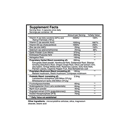 -. Feature : Strengthen & boost your immune system naturally - Avoid or shorten down time due to colds & flu - 120 Vegetarian capsules - 30 day supply / 44 High Potency Ingredients: Antioxidants + Vitamins & Minerals + Herbal & Mushroom Blends + Probiotics + Amino Acids / Vitamins A, C, D3 & E + Zinc + Selenium + Magnesium + Ginseng + Oregon Grape Root + Olive Leaf + Ginkgo Biloba + Echinacea + Ginger and many more! / Proven mushroom blend: Maitake, Reishi & Cordyceps Mushrooms / Potent Probiotics: Acidophilus, Bifidobacterium, IP-6 and more