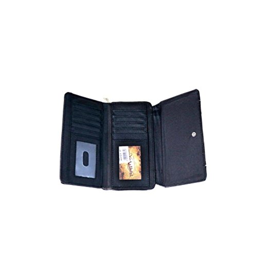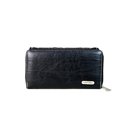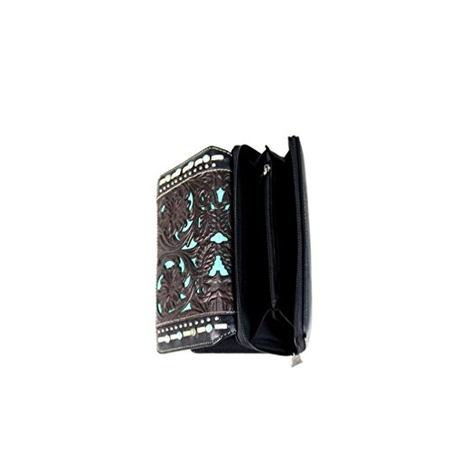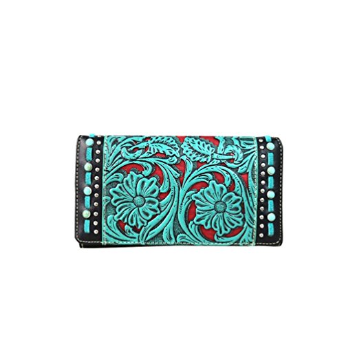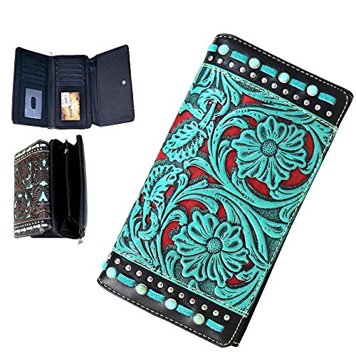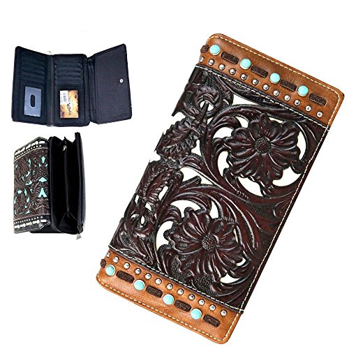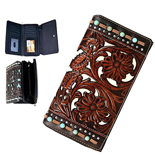 -. Binding : Apparel -. Brand : Montana West -. Department : womens -. Feature : This western secretary style wallet has: Vintage floral tooling on a genuine leather flap with a magnetic closure accented by saddle stitch and with lacing and turquoise stone detailing with silver stud embellishments. / Magnetic snap closure on the front and multi-card slots with 2 long slot bill compartments within. / A zipper enclosure on the back with a single compartment divided by a medium zippered pocket. / Measures: 7.5" x .75" x 4" -. ProductGroup : Apparel -. ProductTypeName : ACCESSORY -. Size : Large -. Title : TR49-W010 Trinity Ranch Tooled Design Collection Secretary Style Wallet with Vintage Floral Tooled Leather