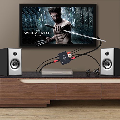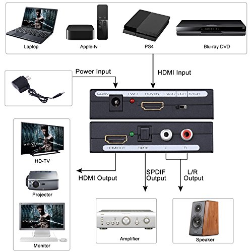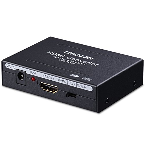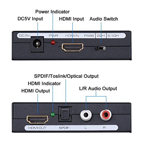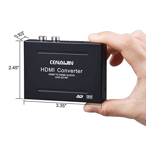 Cenawin 4K HDMI Audio Extractor and Optical SPDIF Toslink L/R Stereo Analog Audio Output for Blu-ray/ DVD/ HD player, Roku or Chromecast etc. Specification: Input Port: 1 x HDMI IN, 3 x EDID Audio(Pass/2CH/5.1CH) Output Port: 1 x HDMI OUT, 1 x SPDIF (Optical), L/R Jack HDMI resolution :4K x 2K, 24/50/60fs/1080P/1080i/720p/576p/576i/480p/480i Support video color format: 24bit/deep color 30bit,36bit Max bandwidth: 225MHz Max baud rate: 6.75Gbps Max working current: 190mA 3 switching audio EDID settings: 1. When your audio source is 2.0, no matter which format(2.0ch/5.1ch) you switch, you only can get 2.0ch. 2. When your audio source is 5.1CH, switch the format to pass,the audio output from optical is 5.1, but the L/R Stereo only can get 2.0CH. 3.When your audio source is 5.1CH, switch the format to 5.1, the aduio output from optical port is 5.1CH, the audio output from the L/R Stereo is 2.0 Kindly Note: 1.Not Support Dolby Digital Plus audio, it is support DTS Audio and Dolby digital audio. 2.NOT SUPPORTcopyright protected content; game headsets Package Contents: 1 X HDMI Audio Extractor 1 x Power Adapter 1 X User Manual ? 0 |