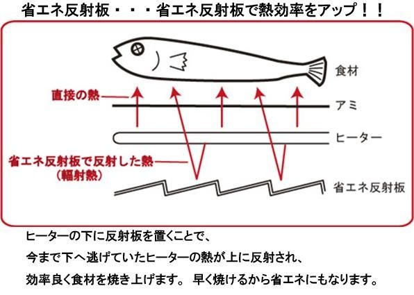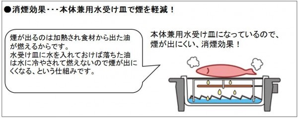ヒーターの下に反射板を置くことで、今まで下へ逃げていたヒーターの熱が上に反射され、効率良く食材を焼き上げます。早く焼けるから省エネにもなります。本体兼用水受け皿になっているので、煙が出にくい、消煙効果! |
