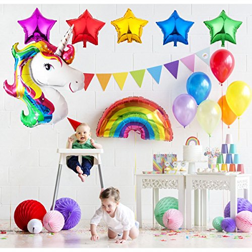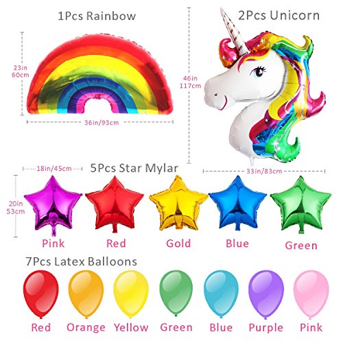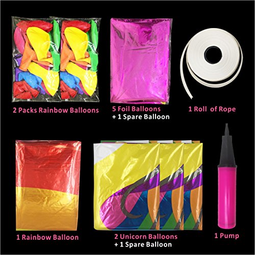 Description: What girl doesn't want her very own unicorn? Even if it doesn't last forever The balloon bouquets include 7pcs latex balloons,5pcs star foil balloons,2pcs rainbow unicorn balloons,1pcs rainbow balloon,1pcs balloon pump, a roll of ribbon Inflated them with regular air or fill with purity of 99.9% helium to stay float,make an atmosphere of happiness and festival Give your party an extra special splash with this rainbow unicorn balloon decorating kit. perfect for a unicorn birthday party,it will a hit at the party It's a very economic way to make a beautiful balloon bouquets for birthday,baby shower,christening,wedding,graduation,party,home,festival and other events