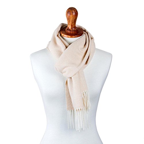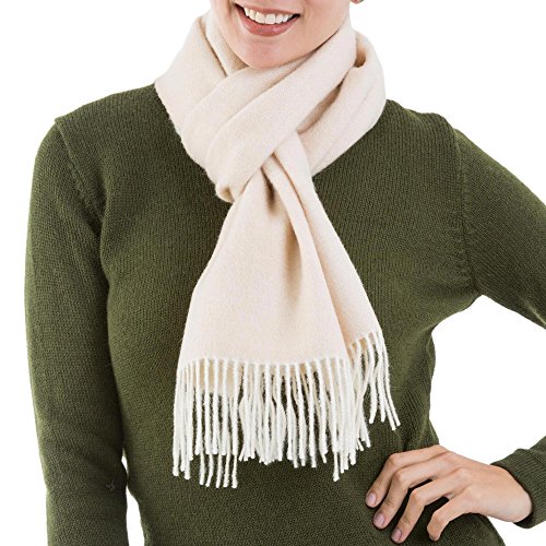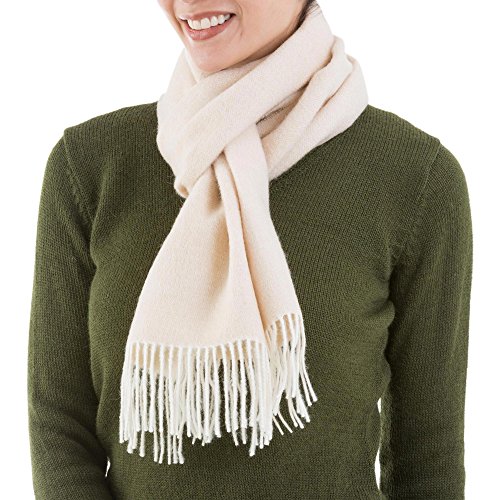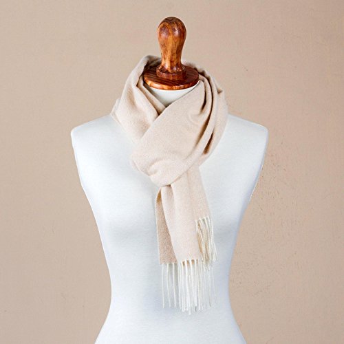 About this item: Soft 100% baby alpaca wool will keep you warm and cozy in this scarf by artisan Felipe Berckholtz of Peru. Featuring an attractive beige fringe, the neutral buff-colored scarf will easily coordinate with any style. Scarf: 66.0" L x 11.75" W Fringe: 3.1" L - Dry clean or hand wash in cold water