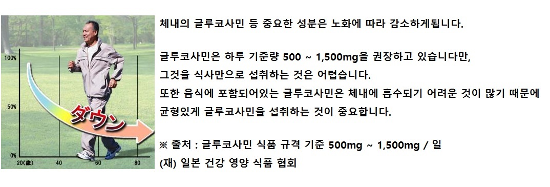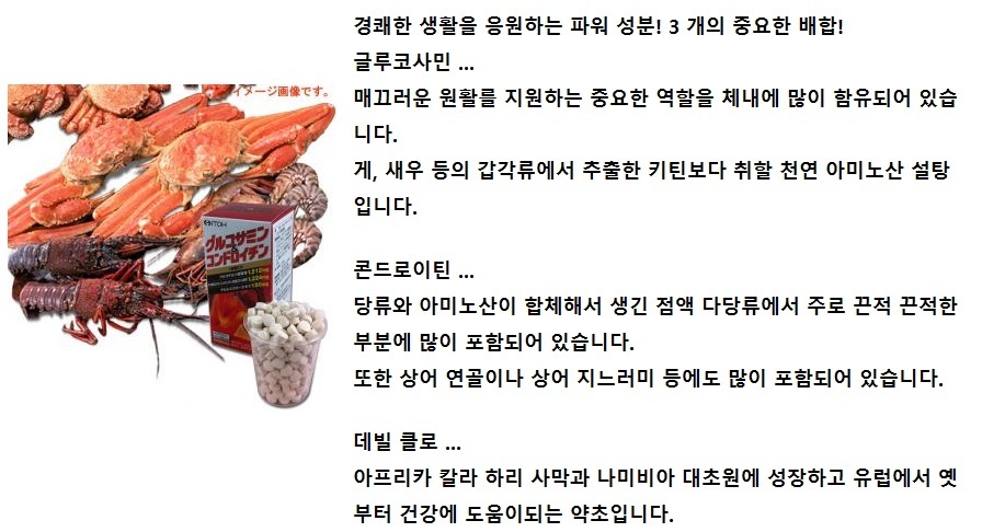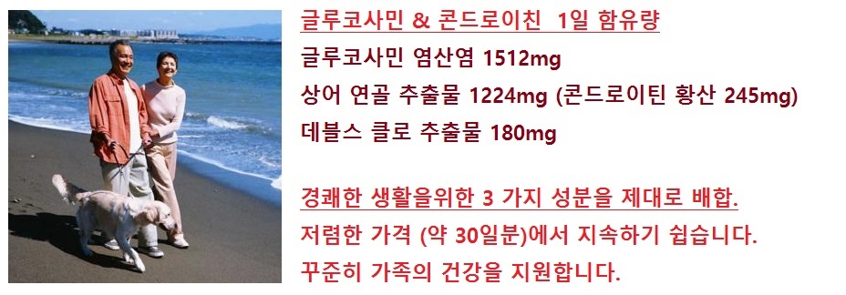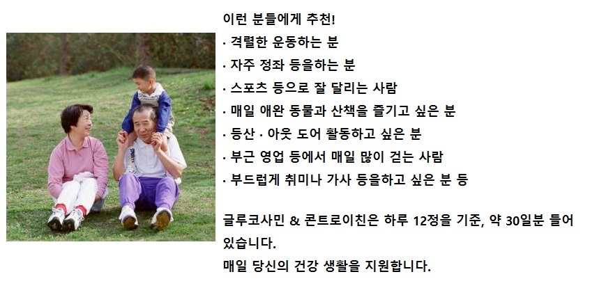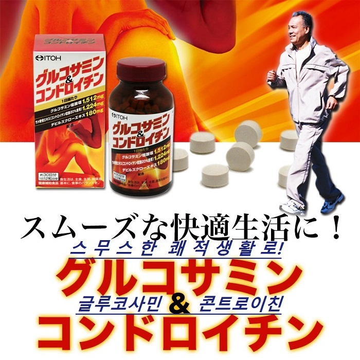 상품 설명[글루코사민 + 콘트로이친]은 글루코사민과 무코 다당체라는 성분의 하나인 콘트로이친을 조합 한 건강식품입니다. 드시는 방법건강 보조 식품으로서 1일 12정을 기준으로 물과함께 드세요.저장 방법고온 다습, 직사 광선을 피하고 서늘한 곳에 보관하십시오.