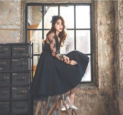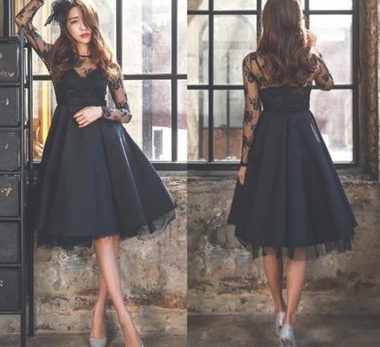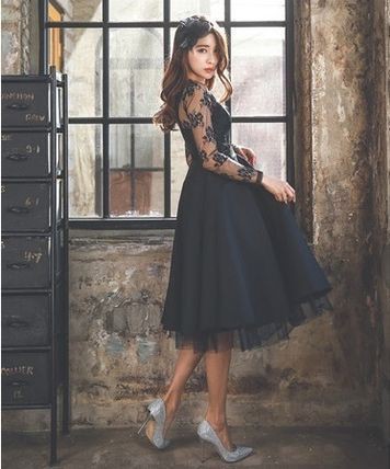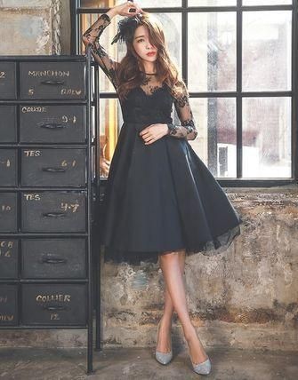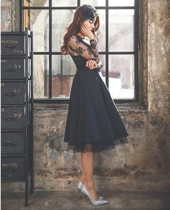 パーティードレス ひざ丈 フレアワンピース 花柄レース ブラック チュール 透け感 セクシー 大人 上品 お呼ばれ drgz2638