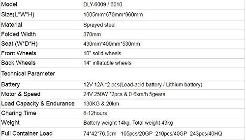 Studio : Culver LED Lighting Solution Corp Publisher : Culver LED Lighting Solution Corp Binding : Health and Beauty Product Description The versatile wheelchair is assembled with Sprayed Steel Foldable chair, 12V 12A * 2pcs Lead-acid batteries, breathable seat and back cushions. 360 degree waterproof universal intelligent Joystick, easy controlling, it has power indicator light, power on/off, horn, speed indication, speed up and down buttons. Apply to all different road types such as grass, ramp, deceleration strip, brick, muddy, snow, bumpy road 24V 250W * 2pcs Motor, Max 4 mph, Range: 13 Miles, Charging Time: 8 hours. Front Wheels: 10 inches, Back Wheels: 14 inches. Seat: 17x16x21 inches. Wheelchairs weight is 60 lb, batteries weight: 30 lb, Total 90 lb. The weight capacity is 300 lbs. The tires are solid inflatable, wear resisting. The front driven wheel is 8" that could rotate 360 degrees which makes it easy for turning. 0