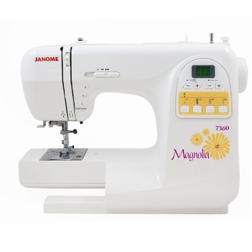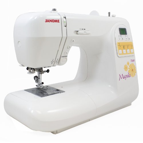 -. Binding : Office Product -. Brand : Janome -. Color : magnolia -. EAN : 0732212301155 -. Feature : 60 stitches including 8 one-step buttonholes with a LED screen / Maximum stitch width - 7 mm and Maximum stitch length - 5 mm / Start / Stop Button and Speed Override / Automatic thread tension control / It even comes with a quilting bonus package included a Walking Foot and a 1/4" foot! -. Label : Janome -. Manufacturer : Janome -. Model : 7360 -. MPN : 7360 -. PackageQuantity : 1 -. PartNumber : 7360 -. ProductGroup : Art and Craft Supply -. ProductTypeName : ART_SUPPLIES -. Publisher : Janome -. Studio : Janome -. Title : Janome Magnolia 7360 Sewing Machine -. UPC : 732212301155