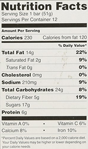 -. Feature : Servings (cont.): Fat 17g (26% DV), Sat. Fat 4.5g (23% DV), Trans Fat Og, Cholest. (0% DV), Sodium (0% DV), Total Carb. 28g (9% DV), Dietary Fiber 3g (12% DV), Sugars lOg, Protein 7g, Vitamin A (0% DV), Vitamin C (10% DV), Calcium (2% DV), Iron (10% DV); [Cashew And Agave Nectar] Nutrition Facts: Serv. Size: 51 g, Servings: 1, Amount Per Serving: Calories 280, Fat Cal. 140, Total Fat 16g (25%DV), Sat. Fat 2.5g (13%DV), Trans Fat 0g, Cholest. 0mg (0%DV), Sodium 5mg (0%DV), Total carb. 30g / Servings: [Spirulina And Cashew] Nutrition Facts: Serv. Size: 51 g, Servings: 1, Amount Per Serving: Calories 280, Fat Cal. 160, Total Fat 18g (27%DV), Sat. Fat 3g (16%DV), Trans Fat 0g, Cholest. 0mg (0%DV), Sodium 20mg (1%DV), Total carb. 29g (10%DV), Fiber 3g (12%DV), Sugars 17g, Protein 7g, Vitamin A (0%DV), Vitamin C (8%DV), Calcium (8%DV), Iron (15%DV); [Coconut And Agave Nectar] Nutrition Facts: Serv size: 1 bar (62g), Servings 1 Amount Per Serving: Calories 270, Fat Cal. 150, Total / Servings (cont.): (10%DV), Fiber 3g (13%DV), Sugars 19g, Protein 7g, Vitamin A (0%DV), Vitamin C (8%DV), Calcium (8%DV), Iron (15%DV); [Raspberry And Chocolate] Nutrition Facts: Serv. Size : 51 g, Servings: 1, Amount Per Serving: Calories 270, Fat Cal.140, Total Fat 16g (25%DV) , Sat. Fat 3g (15%DV), TransFat 0g, Cholest. 0mg (0%DV), Sodium 5mg (0%DV), Total carb. 30g (10%DV), Fiber 5g (21%DV), Sugars15g, Protein 8g, Vitamin A (0%DV), Vitamin C (15%DV), Calcium (6%DV), Iron (20%DV); [Coco / Servings (cont.): nut And Chocolate] Nutrition Facts: Serv. Size: 51 g, Servings: 1, Amount Per Serving: Calories 280, Fat Cal. 170, Total Fat 19g (29%DV), Sat. Fat 6g (31%DV), Trans Fat 0g, Cholest. 0mg (0%DV), Sodium 10mg (0%DV), Total carb. 28g (9%DV), Fiber 5g (20%DV), Sugars 15g, Protein 8g, Vitamin A (0%DV), Vitamin C (8%DV), Calcium (6%DV), Iron (20%DV); [Hazelnut And Chocolate] Nutrition Facts Serv. Size: 62 g, Servings: 1, Amount Per Serving: Calories 280, Fat Cal. 170, Total Fat / Servings (cont.): 19g (29%DV), Sat. Fat 6g (31%DV), Trans Fat 0g, Cholest. 0mg (0%DV), Sodium 10mg (0%DV), Total carb. 28g (9%DV), Fiber 5g (20%DV), Sugars 15g, Protein 8g, Vitamin A (0%DV), Vitamin C (8%DV), Calcium (6%DV), Iron (20%DV); [Chocolate And Cashew] Nutrition Facts: Serv. Size: 51 g, Servings: 1, Amount Per Serving: Calories 280, Fat Cal. 160, Total Fat 18g (27%DV), Sat. Fat 3g (16%DV), Trans Fat 0g, Cholest. 0mg (0%DV), Sodium 5mg (0%DV), Total carb. 28g (9%DV), Fiber 4g (17%