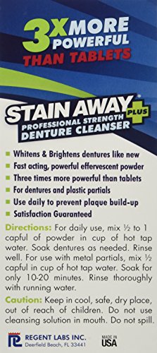 -. Binding : Health and Beauty -. Brand : Stain-Away -. Feature : Fast acting cleanser that whitens and brightens dentures like new plus kills odor causing germs, safe for metal partials. / Fast acting, powerful effervescent powder. / Recommended for full dentures only. / Use daily to prevent plaque build up. / It works all night long to give you a professional cleaning every time. -. Label : Stain Away -. Manufacturer : Stain Away -. Model : 083272981024 -. MPN : 083272981024 -. NumberOfItems : 3 -. PackageQuantity : 3 -. PartNumber : 083272981024 -. ProductGroup : Beauty -. ProductTypeName : BEAUTY -. Publisher : Stain Away -. ReleaseDate : 2008-02-27 -. Studio : Stain Away -. Title : Stain Away Plus Denture Cleanser, 8.1-Ounce (Pack of 3)