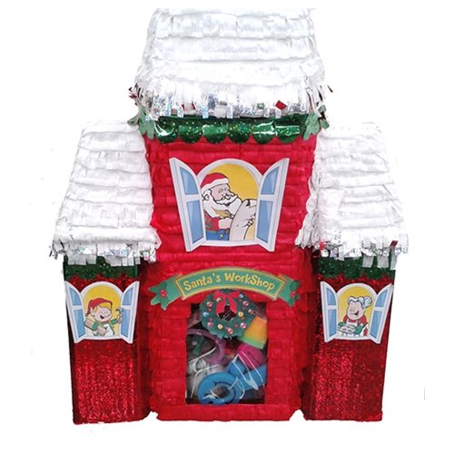 Pinata measures 20 inches high by 16 inches long by 3.75 inches deep. This premium Santa's Workshop Pinata is a festive looking pinata with snowy white roof and sparkly accents. Pinata holds up to 2 pounds of toys and candy (sold separately). Great as table decoration and fun as party game for Christmas parties.