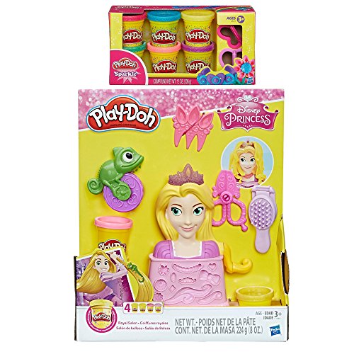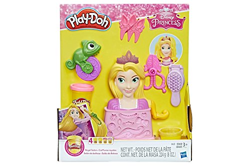 Get creative and give Rapunzel some hair flair at the Royal Salon! With the styling head, tools, and 4 cans of Play-Doh compound, there are so many fun hairstyles to try again and again. To start, simply add a Play-Doh color to the styling head and crank the lever to grow her hair. Now it's time to style! The brush doubles as a mold for colorful curls, and Pascal rolls long braids. Create bows, flowers, and other accessories at the base of the styling head and use the comb and scissors for even more customization. Try adding some shimmer with the included sparkle compound! Hasbro, Play-Doh, and all related properties are trademarks of Hasbro.Feature