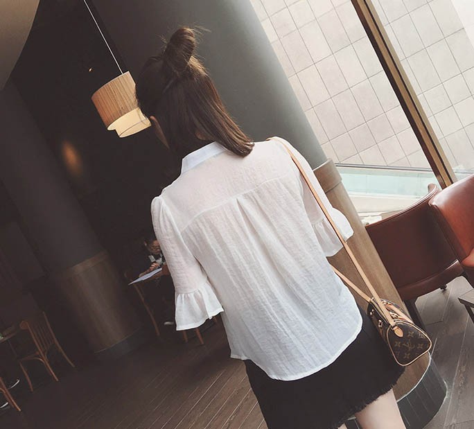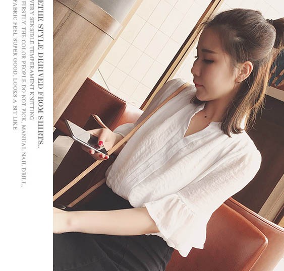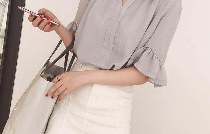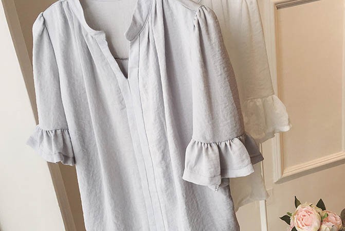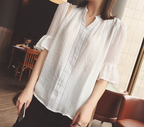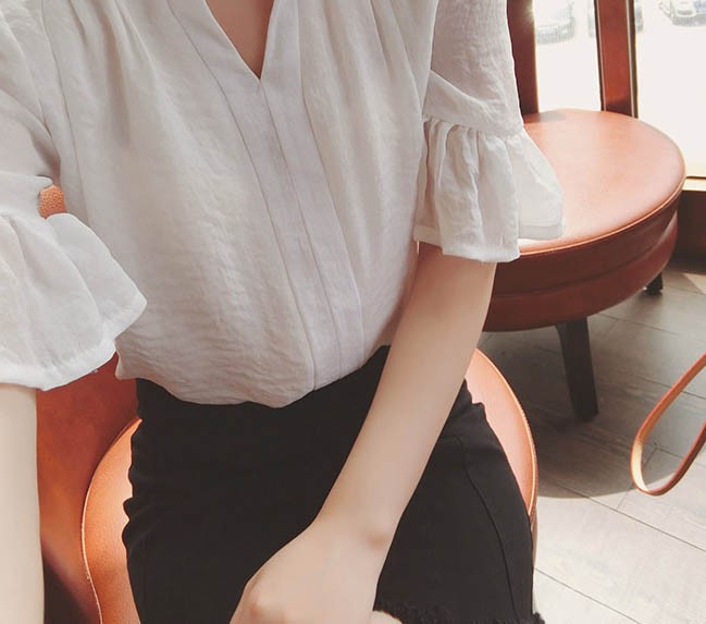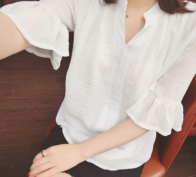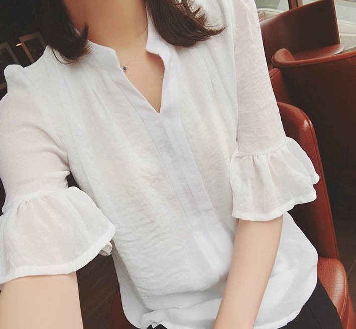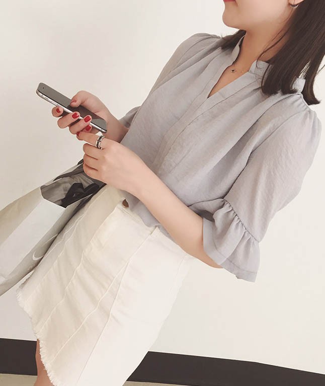 【入荷後営業日2,3日以内出荷予定 通関待ちや不良により出荷遅くなる場合はメールにてご連絡いたします。メール受信設定によっては正常に受信されない場合はございますので、 弊社からのメールを予め受信頂くようご設定くださいませ。】 トップス シャツ ブラウス シフォンブラウス Vネック フレア ラッパ袖 レディス レディース 春 新作 2018Vネックフレア袖シフォンブラウス◆サイズ:着丈55肩幅34袖丈30胸囲88◆素材:ポリエステル