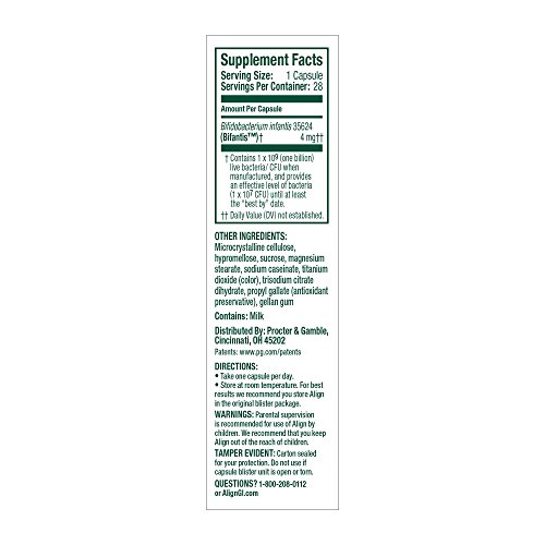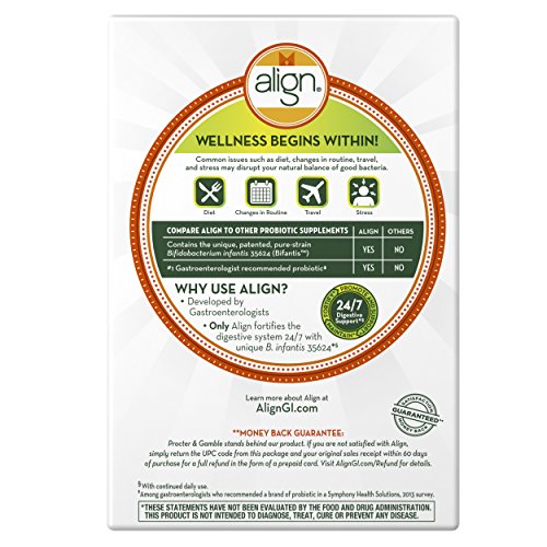 -. Binding : Health and Beauty -. Brand : Align -. EAN : 0037000478669 -. Feature : The #1 Gastroenterologist recommended probiotic (Symphony Health Solutions 2014 survey) / Naturally helps fortify your digestive system with health bacteria 24/7* with continued daily use / Naturally Helps promote and support a health digestive system* / Naturally helps maintain digestive balance* / Contains the natural probiotic strain B. infantis 35624, a unique probiotic strain offered by no other product, including store brands -. IsAdultProduct : 0 -. IsAutographed : 0 -. IsMemorabilia : 0 -. Label : Align -. LegalDisclaimer : IN NO EVENT, REGARDLESS OF CAUSE, SHALL ALL STAR SALES BE LIABLE FOR ANY INDIRECT, SPECIAL, INCIDENTAL, PUNITIVE OR CONSEQUENTIAL DAMAGES OF ANY KIND, WHETHER ARISING UNDER BREACH OF CONTRACT, TORT (INCLUDING NEGLIGENCE), STRICT LIABILITY OR OTHERWISE, AND WHETHER BASED ON THIS AGREEMENT OR OTHERWISE, EVEN IF ADVISED OF THE POSSIBILITY OF SUCH DAMAGES. -. Manufacturer : Align -. Model : PG-4339 -. MPN : PG-4339 -. NumberOfItems : 1 -. PackageQuantity : 1 -. PartNumber : PG-4339 -. ProductGroup : Health and Beauty -. ProductTypeName : HEALTH_PERSONAL_CARE -. Publisher : Align -. ReleaseDate : 2012-08-20 -. Size : 28 Count -. Studio : Align -. Title : Align Digestive Health Probiotic Supplement 28 count -. UPC : 885781060746 -. Warranty : Satisfaction Guaranteed or your money back. We stand behind our product. If you are not satisfied with Align probiotic supplement, simply return the UPC code from this package and your original sales receipt within 60 days of purchase for a full refund. Visit AlignGI.com/Refund for details.