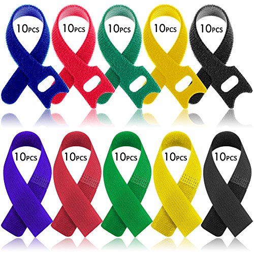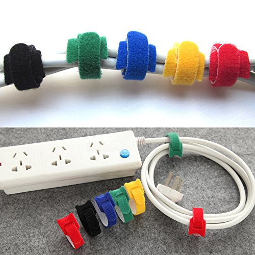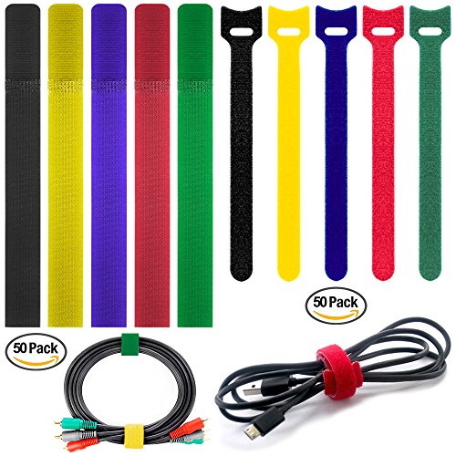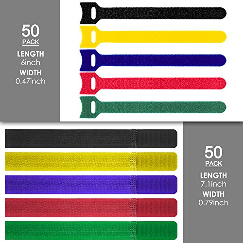 PACKAGE AND COLORS: 50 x Hook & Loop Strip (6" x 0.47") with 5 colors, 50 x Cable Cord Ties (7.1" x 0.79") with 5 colors.