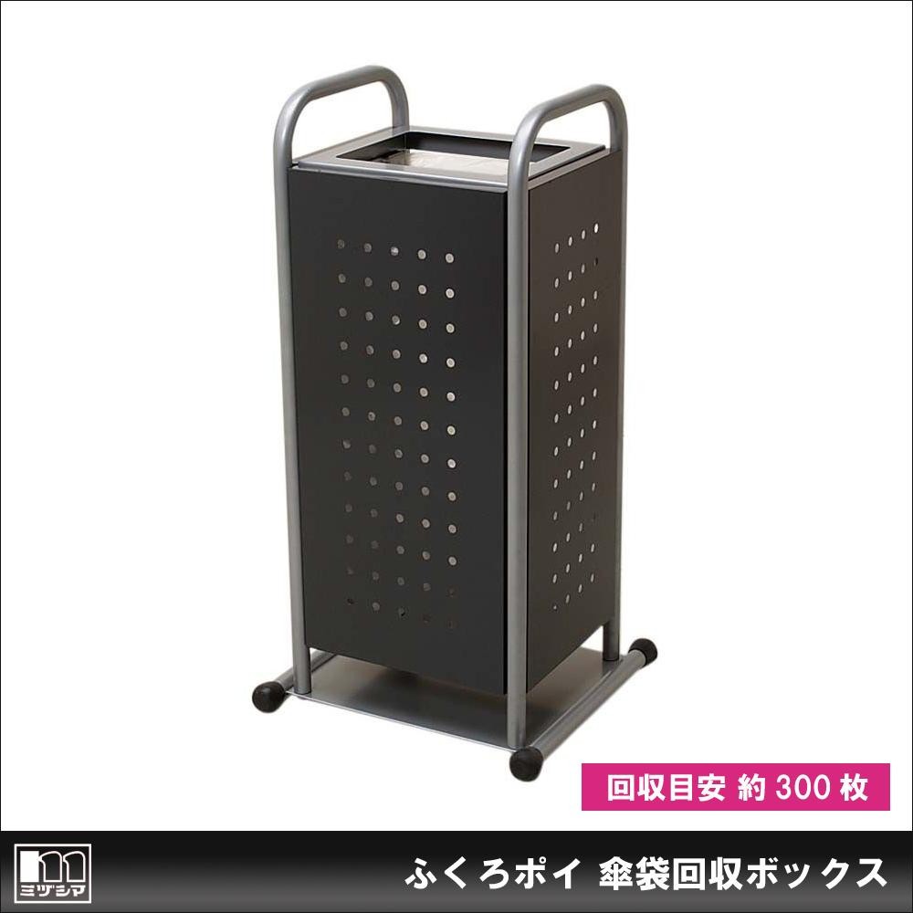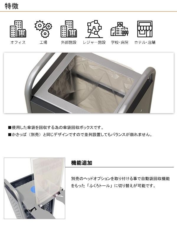 使用した傘袋を回収する為の傘袋回収ボックスです。かさっぱ(傘袋装着機)と同じデザインなので、並列設置してもバランスが崩れません。別売のヘッドオプションを取り付ける事で、ワンステップで傘袋が回収できる「ふくろトール」に変更可能です。 |
