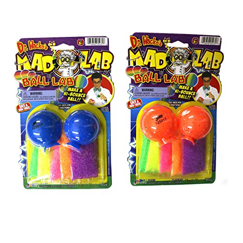 -. Binding : Toy -. Brand : Dr. Wacko -. EAN : 0688953133664 -. Feature : Make your own colorful hi-bounce ball with this kit. / Outer ball mold comes in assorted colors. / All packs come with 5 different colors for the balls ( green, yellow, pink, orange, purple). / Just need water and follow directions. / Great activity for kids as they make their own bouncy balls. -. IsAdultProduct : 0 -. Label : JA-RU -. Manufacturer : JA-RU -. ProductGroup : Toy -. ProductTypeName : TOYS_AND_GAMES -. Publisher : JA-RU -. Studio : JA-RU -. Title : Dr. Wacko’s Mad Lab Ball Lab Make a Hi-Bounce Ball (2 pack assorted colors) -. UPC : 688953133664
