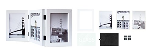 DESIGN: White hinged frame with sturdy hinges to provide support. Elegantly displays THREE 5x7 inch pictures side-by-side. The frame is made with a thick 2mm glass front that can be removed and polished.