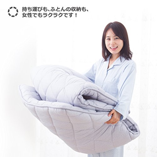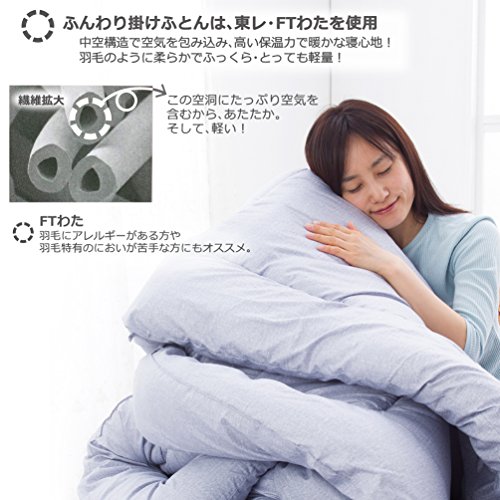 詰めものに東レFTわたを使用し、軽量ながらふっくらしたボリューム感を実現しました。特殊な中空素材なので、糸1本1本が空気をたっぷり含んであったか。まるで羽毛布団のようなもちもち触感で、気持ちよくお休みいただけます。