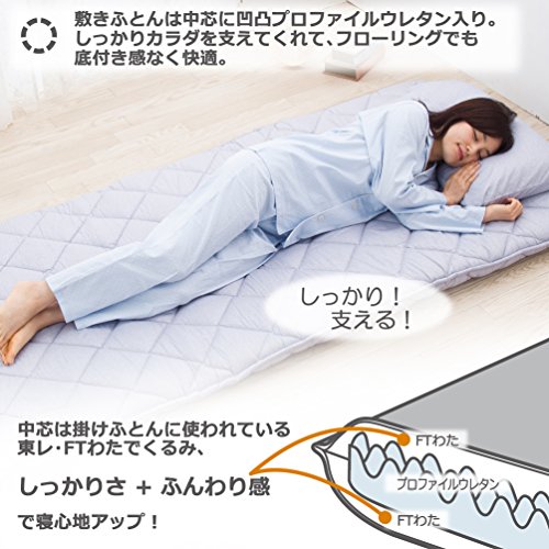 中芯には凹凸プロファイルウレタンを使用し、身体をしっかり支えてくれます。中芯の上下にはもちもちの東レFTわたを使用し、身体を支えながらやわらかい肌あたりで快適です。
