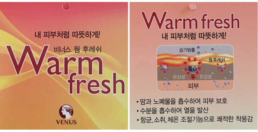 열을 발산하여 체온을 유지시켜 주는 웜후레쉬 소재입니다.