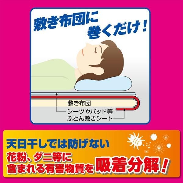 寝具は住空間において最もダニの発生が多い場所といわれており、それ故アレルゲンも非常に多くあります。当商品は、アレルゲンを吸着分解する抗アレルゲンシートです。敷き布団に巻くだけで花粉、ダニなどに含まれる有害物質を吸着分解します。 |
