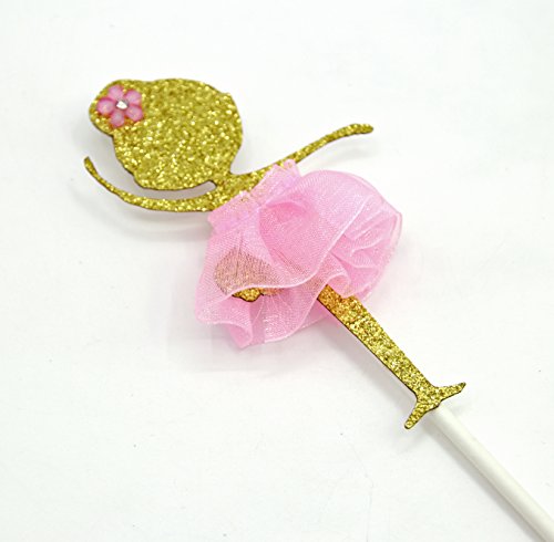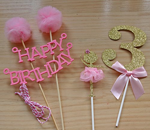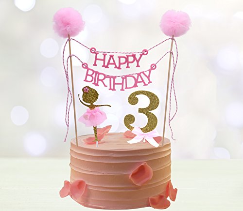 The "HAPPY BIRTHDAY" cake bunting topper is made of felt, two poles are made from biodegradable food safe wood with two pom poms attached. The ballerina is made from white card stock. Her tutu is made from tulle. "3" cake topper is made of gold glitter cardstock with pink bow attached.