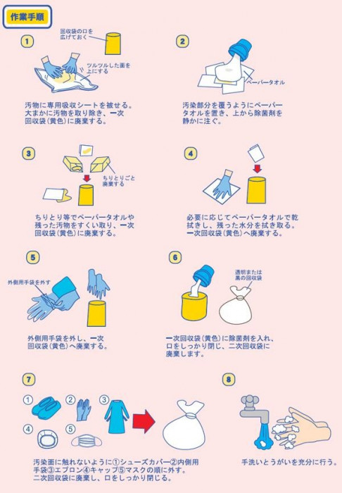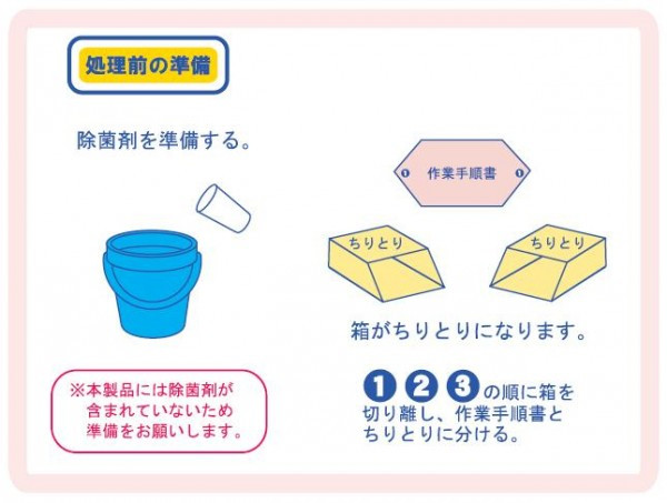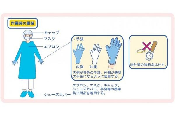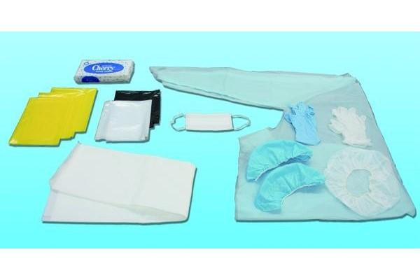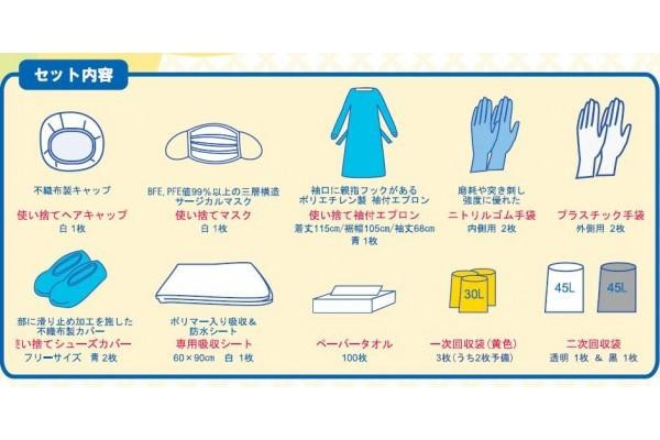 | 素材・材質 | 不織布製キャップ:不織布 サージカルマスク/マスク部:不織布、ノーズピース:針金、耳かけ:ゴム 使い捨て袖付エプロン:ポリエチレン・袖しぼり輪ゴム ニトリルゴム手袋:合成ゴム プラスチック手袋:塩化ビニル樹脂 使い捨てシューズカバー:不織布 専用吸収シート/表:不織布、中身:ホワイトティッシュ・パルプ、裏:ポリシート ペーパータオル:再生紙 一次回収袋黄色:リニアポリエチレン 二次回収袋:リニアポリエチレン |