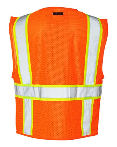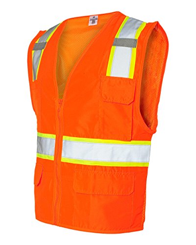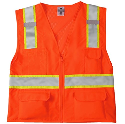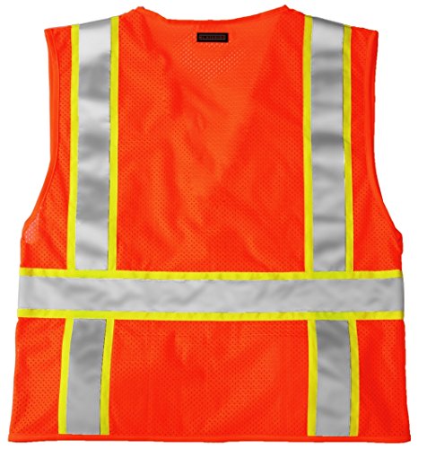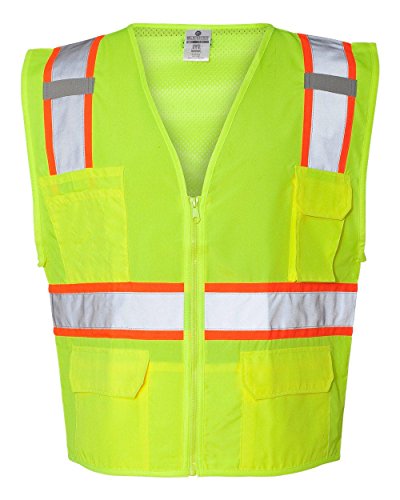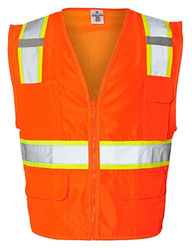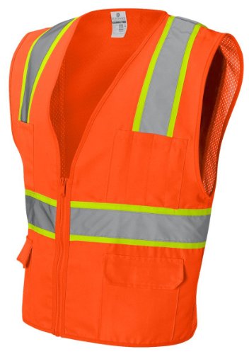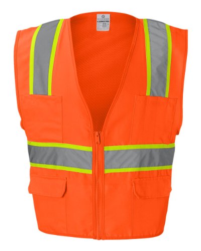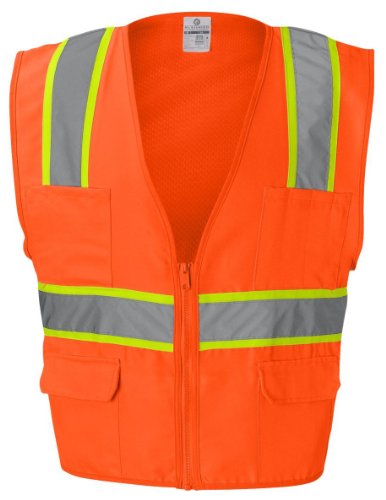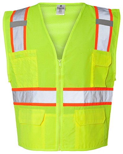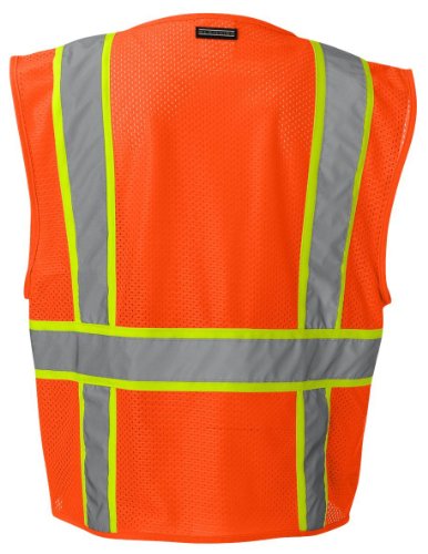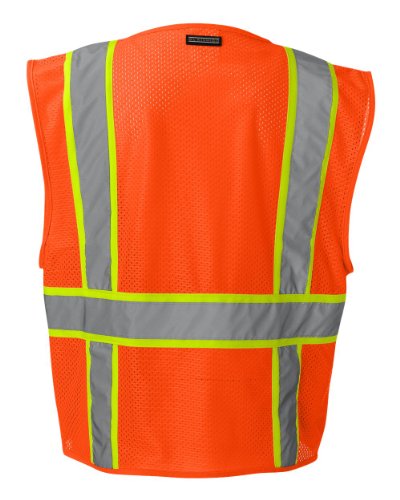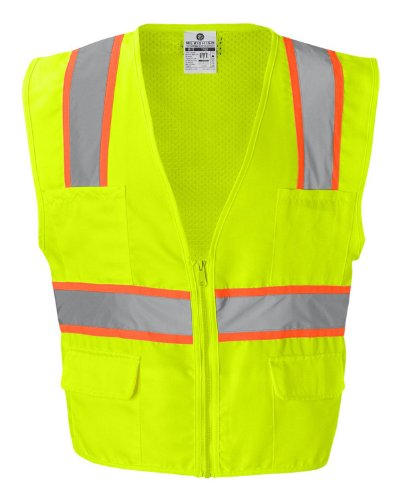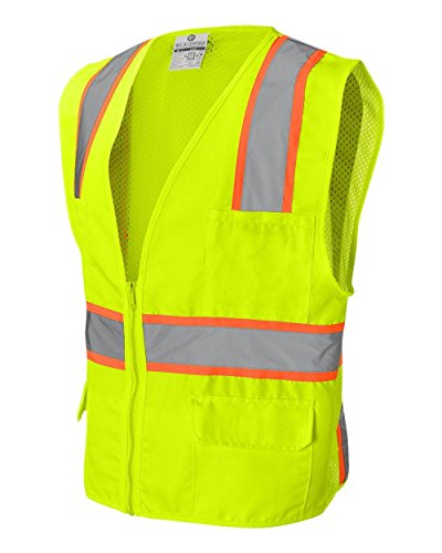 Binding : Misc. Product Description ML Kishigo mesh back solid front vest. Comfortable Ultra-Cool mesh material on back with solid front. Zipper front closure. 2-inches wide VizLite reflective materials with 3-inches contrasting color. Pockets: two lower outside patch pockets with flaps, right chest 2-division pocket, left chest 4-division pocket, two lower inside patch pockets. ANSI/ISEA 107 class 2 compliant. Lime/Orange color. 0