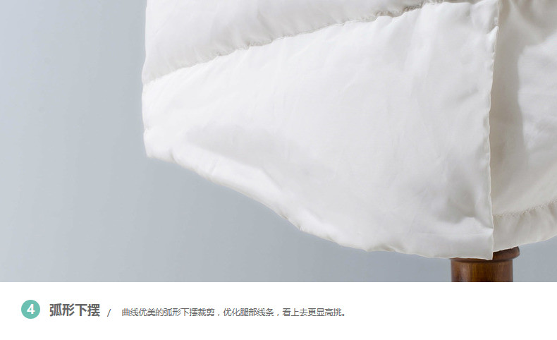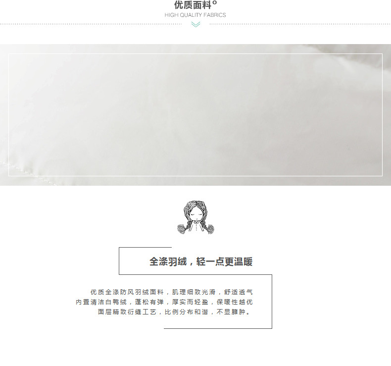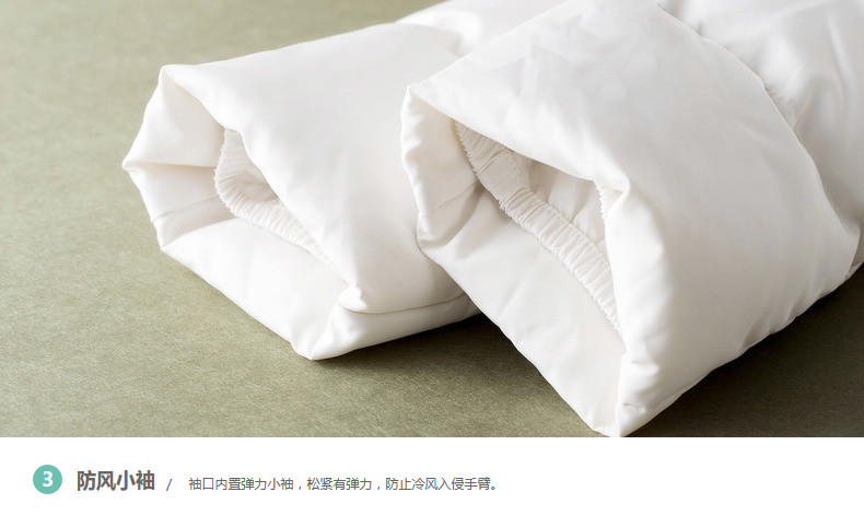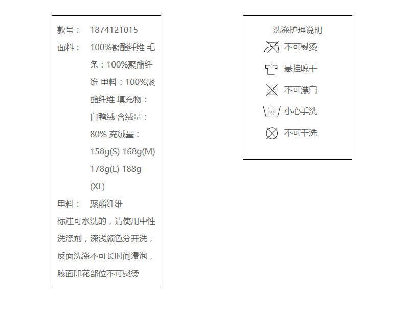 100%聚酯纤维 毛条:100%聚酯纤维 里料:100%聚酯纤维 填充物:白鸭绒 含绒量:80% 充绒量:158g(S) 168g(M) 178g(L) 188g(XL)