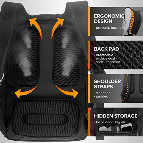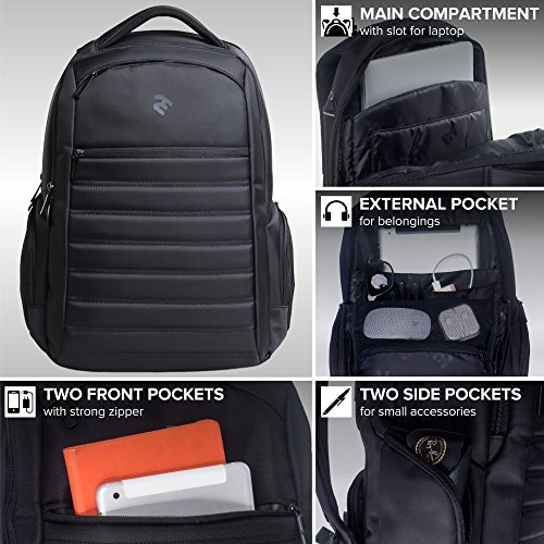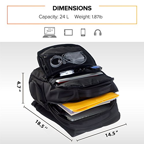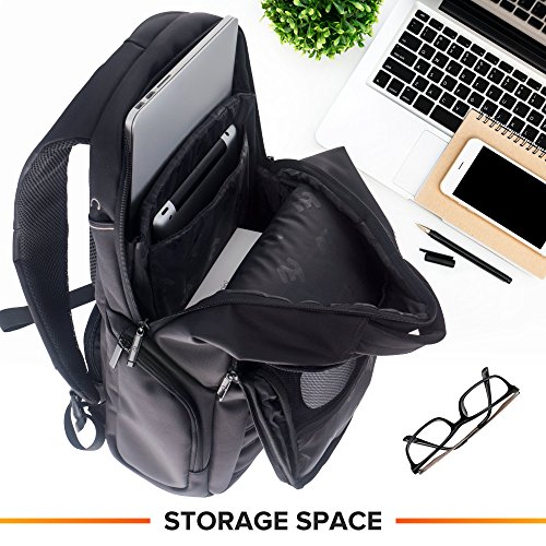 -. Feature : BUSINESS LAPTOP BACKPACK - With a size of 18.5 x 14.5 x 4.7 inches and a 24L capacity, our computer bag backpack offers enough storage space for all your everyday essentials. Moreover, the lightweight design of this computer laptop backpack lets you carry it comfortably & the bubbled cushion enhances safety! / EASY ORGANIZATION - With 1 primary compartment for safely storing a notebook (up to 15.6 inch) & in addition a tablet upto 10", a secondary compartment with 2 pockets for smartphone, hard disk, etc., 2 holders for pen, pencils or stylus, a pocket for daily diary, and enough space for some A4 documents, 2 zippered pockets on front for other accessories, and 2 more side pockets. / PREMIUM BUILD - Designed for performance, our Laptop bag backpack boasts water-resistant fabric, strong & smoothly running zippers, reinforced top mounted handle for extraordinary durability, and adjustable back straps - travel rucksack comes with headphone port & hidden back pocket. / SAFETY & ERGONOMIC DESIGN - Experience unparalleled comfort with padded back and design that allows for sufficient air circulation, ensure safety with cushioned shock-resistant bottom & side walls, and use this black portable laptop backpack as a School book-bag, for college, or as a Gaming Laptop Backpack. / GUARANTEE - With our 100% RISK-FREE SATISFACTION GUARANTEE on this Adjustable Laptop Back Pack, you have got nothing to lose! Can conveniently accommodate all major laptop brands, including Mac, Samsung, Lenovo, HP, Acer, Toshiba, Dell, Sony, etc.