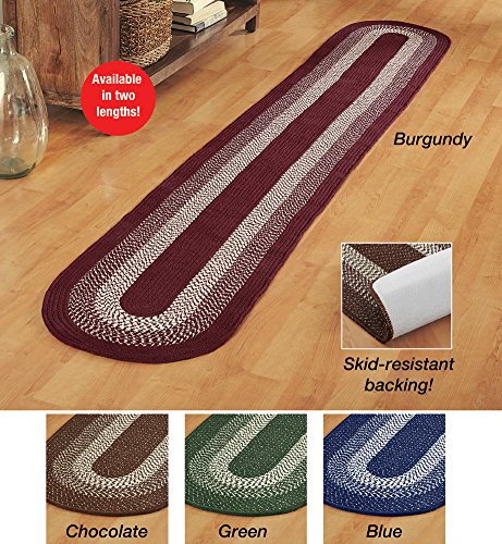 Studio : Collections Etc Publisher : Collections Etc Product Description This extra-long runner is perfect for protecting your high-traffic areas. Available in Chocolate Brown, Green, Navy or Burgundy, these traditional braided runners feature a dark center and border. Skid-resistant backing. Spot clean only. Latex and olefin; imported. Specify Size: 72" x 20", or 120" x 20". 0