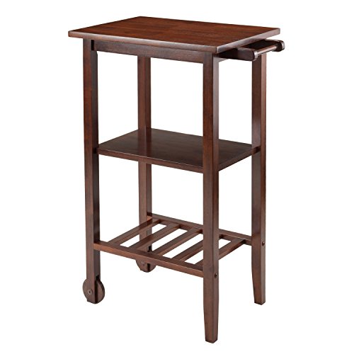 Studio : Winsome Trading DROPSHIP Publisher : Winsome Trading DROPSHIP Binding : Kitchen Product Description This Stevenson kitchen cart is perfect for small spaces in kitchen or dining room. This cart will bring beauty to your kitchen while you work or simply use it for microwave stand or as a storage cart. The cart features one shelf and bottom slated shelf is for wine rack or use as a regular shelf. With one handle, it is easy to move your cart with two wooden wheels. Overall cart size is 24.60"w X 15.83"d X 36"h. Cart top surface is 21.65"w X 15.75"d. Middle solid shelf is 18.6"w X 14"d. Bottom slated shelf can hold up to 4 bottles of wine or use it as a shelf with area of 15.5"w X 14"d. Cart top height is 36" from ground. Made from solid wood in warm walnut finish. Assembly required. 0