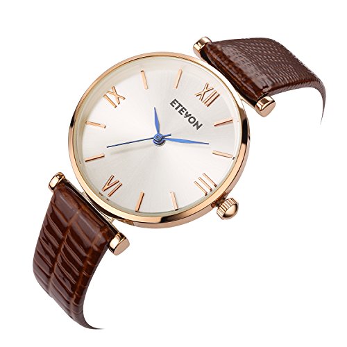 Brand, Seller, or Collection Name:ETEVON Model number:0747100093586 Part Number:EGD6031 Model Year:2017 Item Shape:Round Display Type:Analog Clasp:Buckle Case material:Metal Case diameter:1.30 inches Case Thickness:0.30 Band Material:genuine leather Band length:Women's Standard Band width:0.50 inches Band Color:Brown Dial color:White Bezel material:Metal Special features:waterproof, stainless steel back case, japanese long usage battery Movement:Japanese quartz Water resistant depth:30 Meters