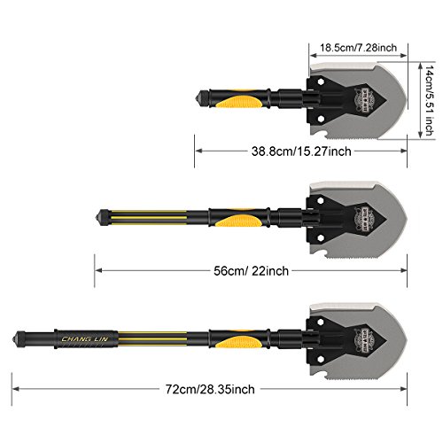 PORTABLE DIMENSION: 7.87x5.91x2.76inch/20x15x7cm small size and 3.2lb product weight with storage bag, 0.01inch/0.2mm shovel thickness, 7.28x5.51x0.08inch/18.5x14x0.2cm shovel board, 3.35inch/8.5cm knife length. Easy adjustable length with 28.35inch, 22inch and 15.27inch. Easy been put in your backpack, car for camping, ice breaking, fishing, cooking meals and emergency use.