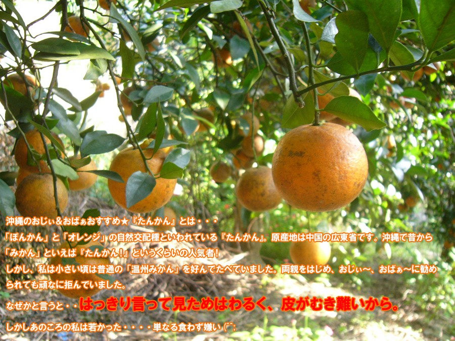 | 沖縄産たんかんは年々、人気が出ており、(リピーターのお客様ありがとうございます。) 今年は今帰仁のおじぃのタンカンに加えて、国頭村の仲村さん、名護のヤラさんにも協力していただくことになりました。 収穫は1月下旬以降からですが新しい生産者の仲間も加わった!『沖縄産たんかん成長日記』(メルマガにて配信)もお楽しみながらお届けまでお待ちください♪ | ||