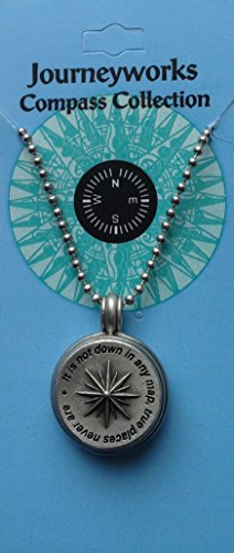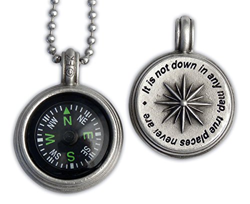 "It is not down in any map, true places never are." Let the words of Herman Melville, an American classic, guide your journey. Designed and manufactured in the USA by Journeyworks, this compass pendant features a Compass Rose and a quote from Moby Dick on the front side of the pendant, with a working compass capsule on the back side of the pendant. Each pendant is cast in solid pewter and features a 24" aluminum ball chain necklace. The natural silver color of solid pewter jewelry goes with almost anything, and won't tarnish over time. The symbolism of the compass is perfect for so many occasions. And the fact that this pendant is equipped with a true working compass, could make the pendant a life-saving tool, if not just a great assistant in a time of need. Pendant Dimensions: 1" diameter plus 3/8" pendant loop.Feature