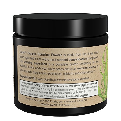 -. Feature : ONLY THE BEST | Smart138 brings you the highest quality, nutrient-rich organic Spirulina, and nothing else / STAY HEALTHY | Our Spirulina is gluten free, non-GMO, pesticide free, and preservative free and only contains 10 calories / BE GREEN | You don't have to feel guilty for getting your protein intake with this completely vegan, vegetarian, and kosher nutrient source / BE SMART | Spirulina powder helps you increase brain function, immune support, eye health, boost energy and vitality, as well as even help with weight loss / GREAT FOR MIXING | Perfect for blending into smoothies or baked treats for some extra vital nutrients