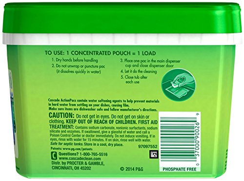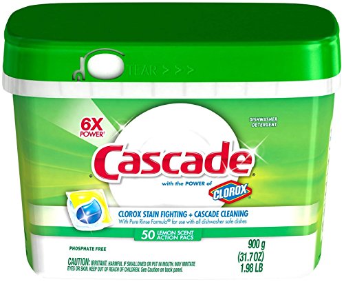 Studio : Cascade Publisher : Cascade Binding : Health and Beauty Product Description Cascade with the Power of Clorox Lemon Scent Dishwasher Detergent Action Pacs combine Clorox stain-fighting and the power of Cascade for a clean that makes unsightly stains disappear. Over time, your dishes can become stained and discolored from coffee, tea, and other foods. When scrubbing alone isn't enough, reach for Cascade with the Power of Clorox Action Pacs. They combine the trusted cleaning power of Cascade with added Clorox stain-fighting for dishes that look as flawless as the food on them.;Pure rinse formula rinses cleanly away Safe to use on all dishwasher-safe dishes;Also available in powder and gel 0